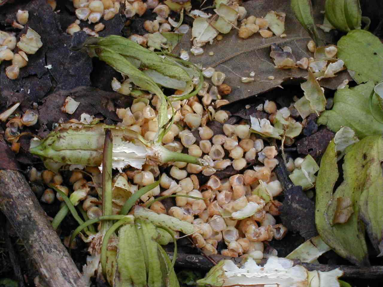 This is a Hibiscus seed pod that has been opened and eaten by some type of small rodent. Each one of the small seeds has been opened, and had the contents eaten. |