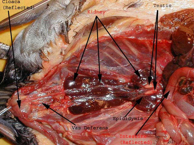 The reproductive system of the Duck is similar to that of the snake. It contains the testes where sperm is produced. The sperm is emptied into the epididymis, and then carried by the vas deferens to the cloaca. The Duck however has some other specializations in addition to this basic layout that the snake does not have. In the Duck, the testes contain a network of interconnected seminiferous tubules. Seminal vesicles are small, flat structures that open into the vas deferens near the terminal end. The duck has a single intermittent organ called a phallus. The testes drastically increase in size during the mating season and are very reduced when not in the mating season, as seen in the first picture below (Chiasson 1959). The cloaca is present in most primitive gnathostomes and persists in embryos of almost all vertebrates. For this reason the cloaca in birds as well as reptiles seems to be a primitive vertebrate feature. External fertilization seems to be most common in early vertebrates, while internal fertilization using an intermittent organ such as the phallus in the duck seems more prevalent in later vertebrates. This may be due to the increase in sperm transfer success by using an intermittent organ in conditions where external fertilization would be disadvantageous (Kardong 2002).
