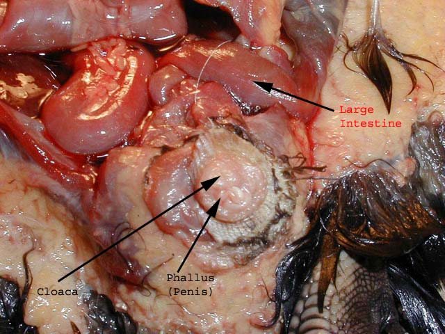 The phallus is the single intermittent organ of the Duck, and is similar to the penis of other taxa and the hemipenes of the Copperhead snake. The phallus is known as the “true penis,” and is only found in the domestic birds such as the duck, chicken, turkey, and geese. It is not present in the many other birds. The phallus is responsible for directing sperm into the urodaeum of the female from the cloacal region of the male (Chiasson 1959). The phallus contains a shaft around the penis itself. When not erect, the penis is found coiled along the ventral wall of the cloaca. It is thought that erection occurs by the filling of internal chambers instead of muscular means. This projects the penis from the cloaca causing it to bend forward (Kardong 2002).