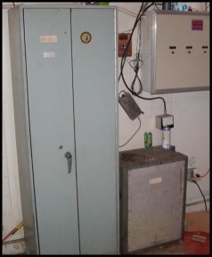 Left: The .94/34 K4MSU antenna: High atop the Price Doyle Fine Arts building on the MSU campus, at roughly 200 feet above average terrain. Right: The .94/34 repeater cabinet and (duplexer cabinet to its right). These reside in the elevator machine room known as the Price Doyle "Penthouse". Here we enjoy the benefits e-Power back up. | ![]() |