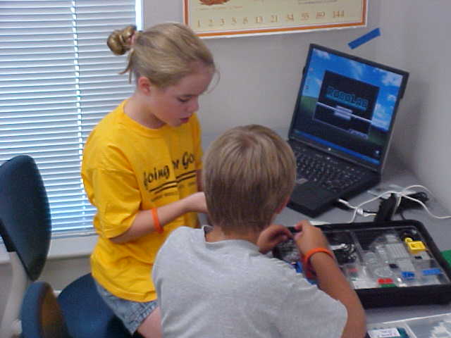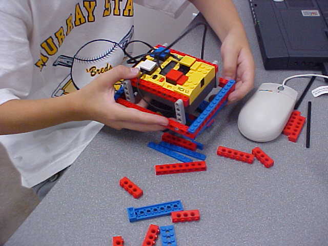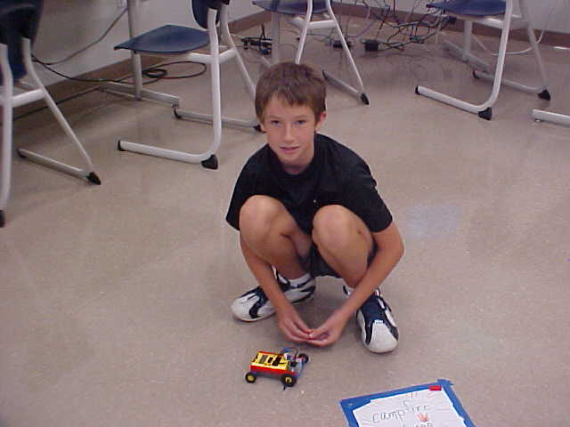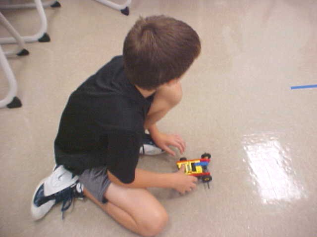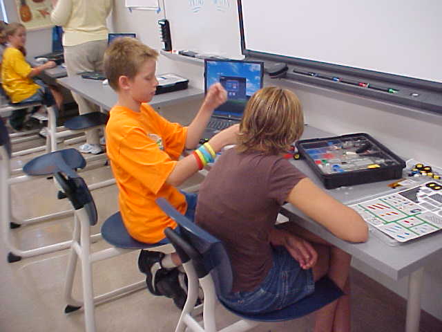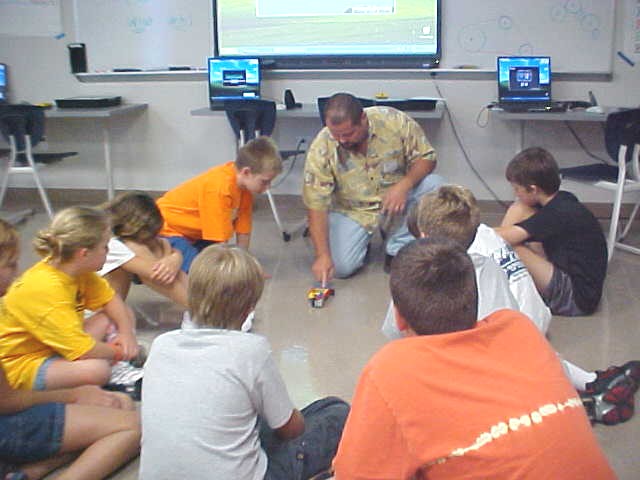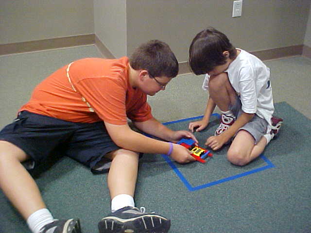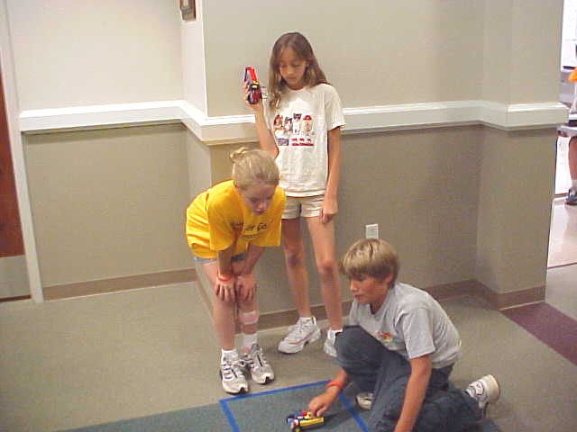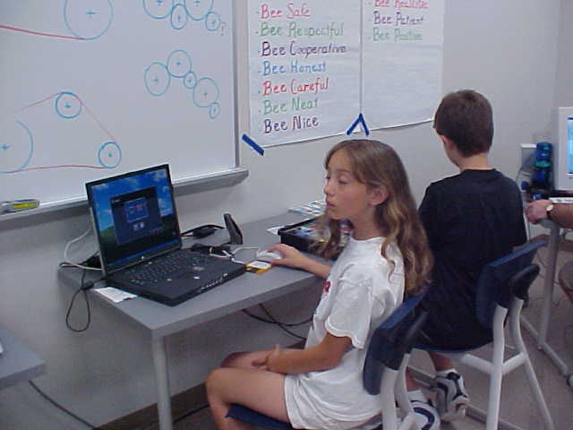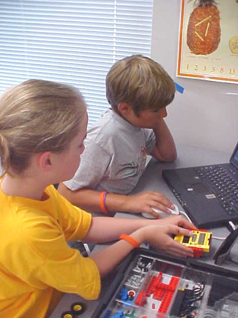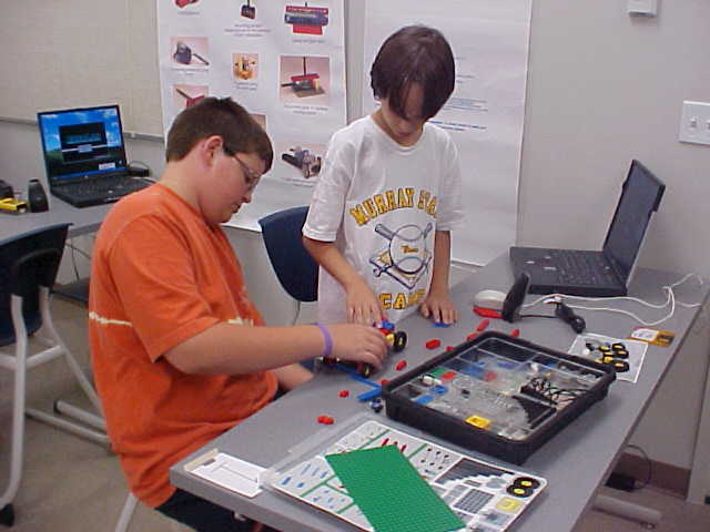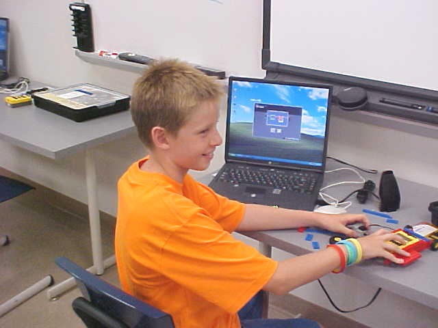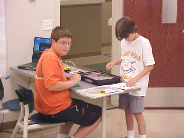 Day 3 was the turning point of Robotics Camp 2005 at Murray State. This was our first day of programming the RCX brick to complete challenging tasks using Pilot 1 of the RoboLab software. "Walk the Dog" was the name of the challenge that provided campers the chance to use the fundamentals of programming. Next, the campers were required to add a step to their program which allowed their vehicle to back from one box into another. Then came a multiple step program using Pilot 3. This made use of changing the direction and the speed of the motors. The words "what" and "until" took on new meaning. "What" was the motor turning one direction or the other, and "until" was the length of time until the RCX told the "what" (the motor) to stop. Campers also began programming multi-step programs and designing their vehicles to make turns, the "Left Turn" challenge. Today's campers will never look at left turns the same ever again. All campers were excited and are already planning for other challenging events for tomorrow, including the use of touch sensors and light sensors!