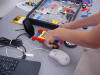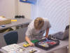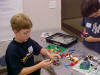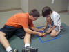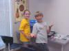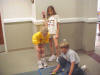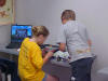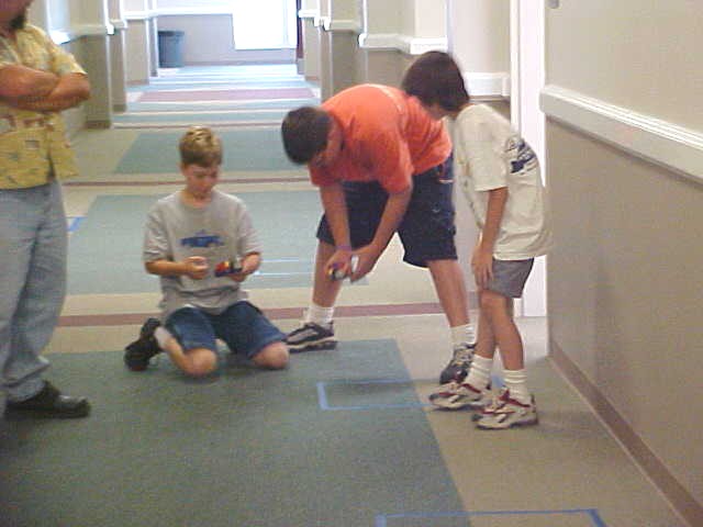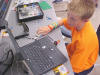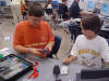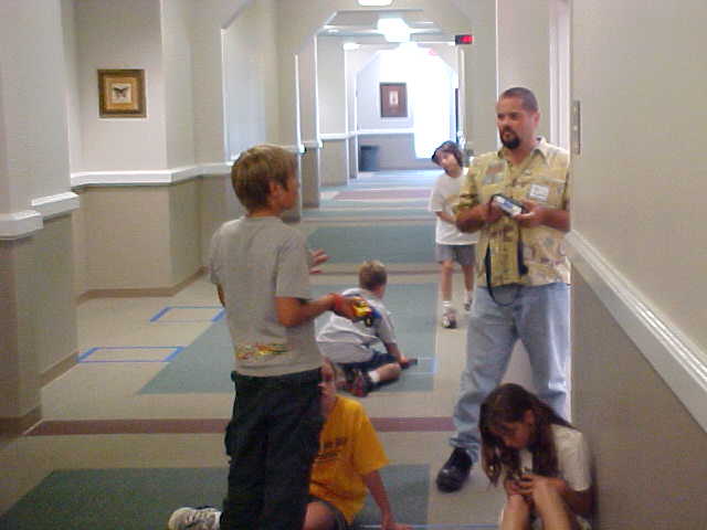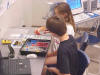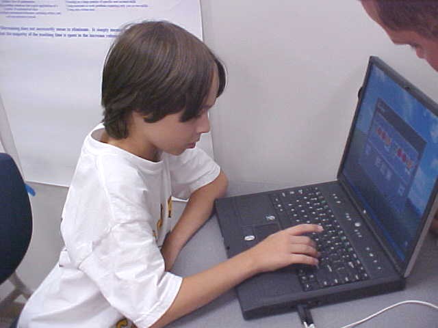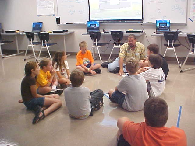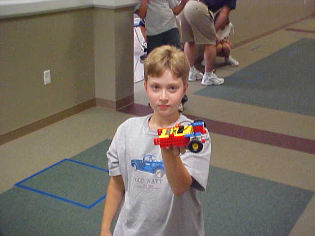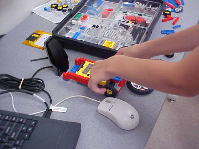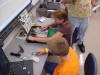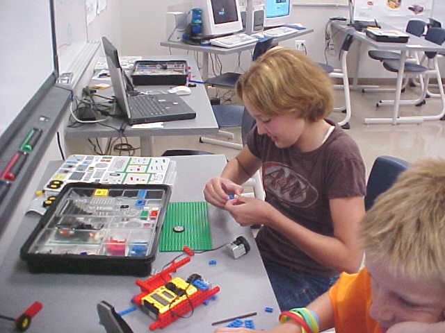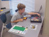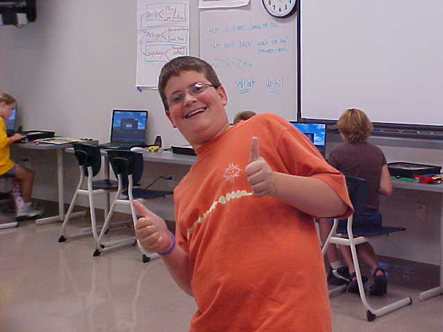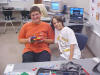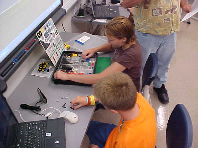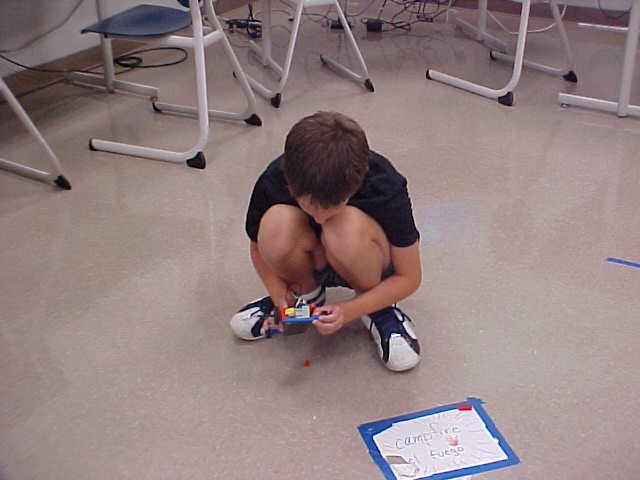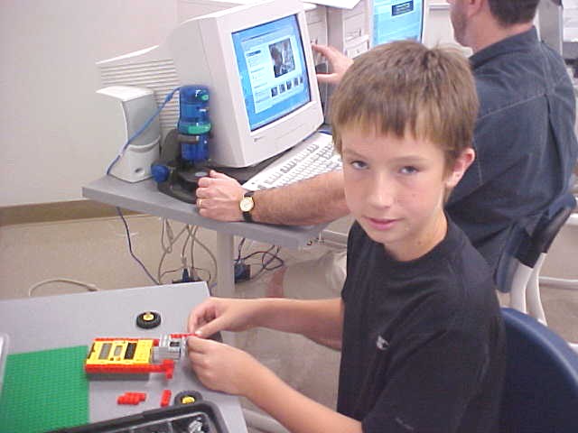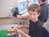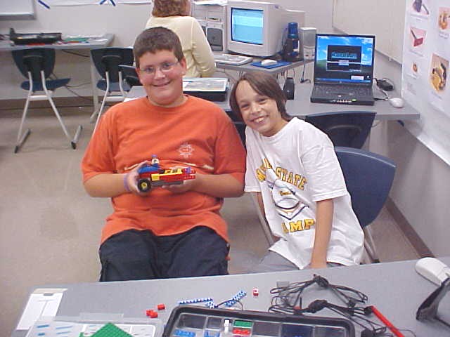 Day 3 was the turning point of Robotics Camp 2005 at Murray State. This was our first day of programming the RCX brick to complete challenging tasks using Pilot 1 of the RoboLab software. "Walk the Dog" was the name of the challenge that provided campers the chance to use the fundamentals of programming. Next, the campers were required to add a step to their program which allowed their vehicle to back from one box into another. Then came a multiple step program using Pilot 3. This made use of changing the direction and the speed of the motors. The words "what" and "until" took on new meaning. "What" was the motor turning one direction or the other, and "until" was the length of time until the RCX told the "what" (the motor) to stop. Campers also began programming multi-step programs and designing their vehicles to make turns, the "Left Turn" challenge. Today's campers will never look at left turns the same ever again. All campers were excited and are already planning for other challenging events for tomorrow, including the use of touch sensors and light sensors!