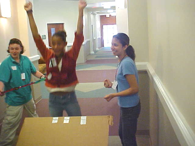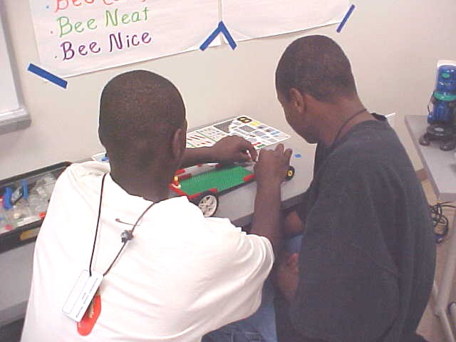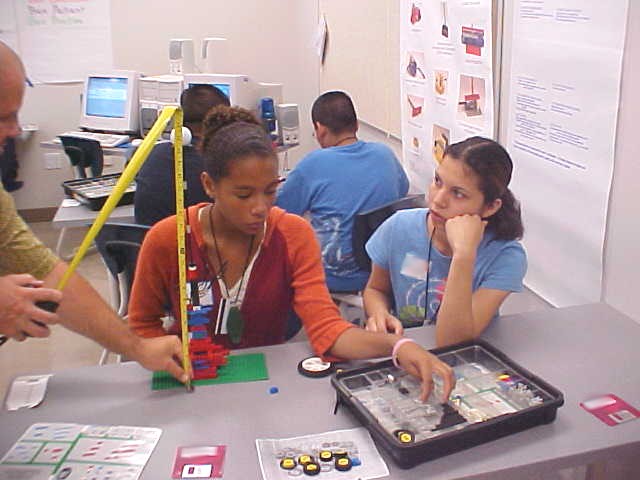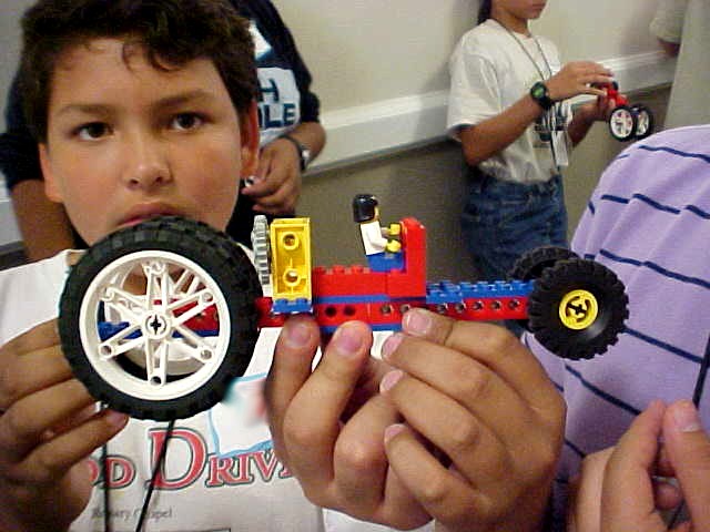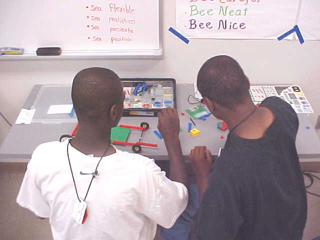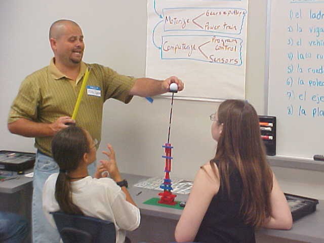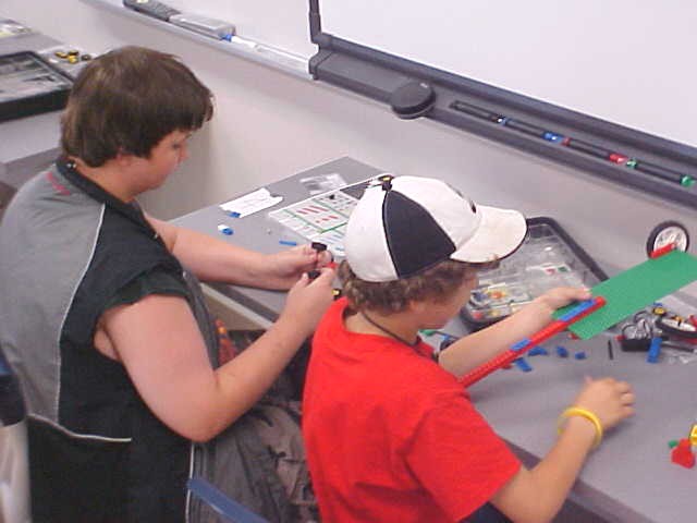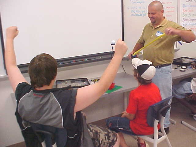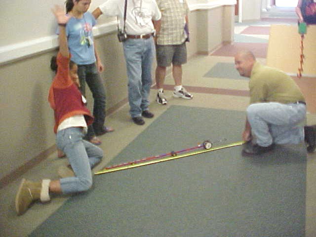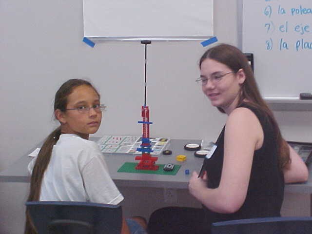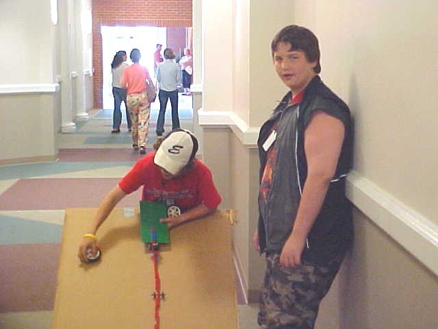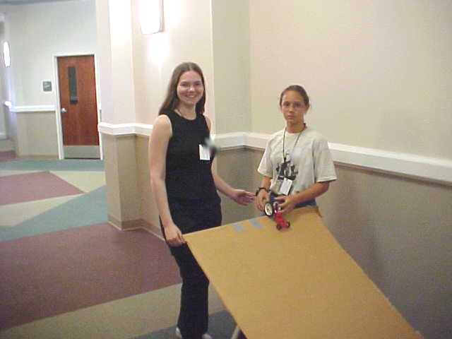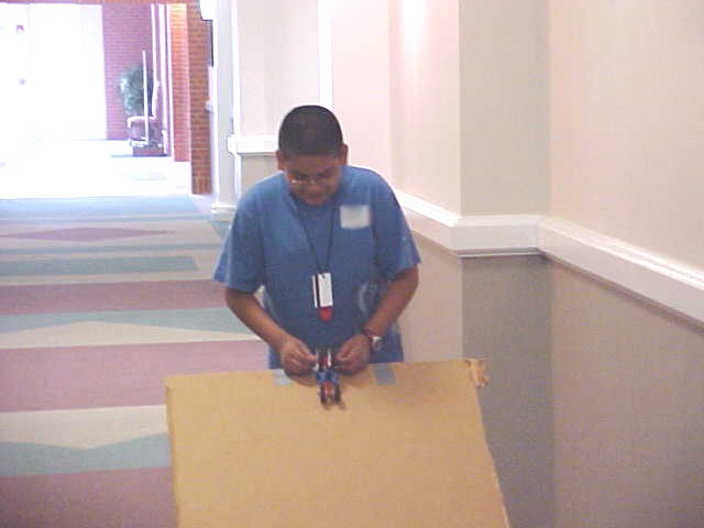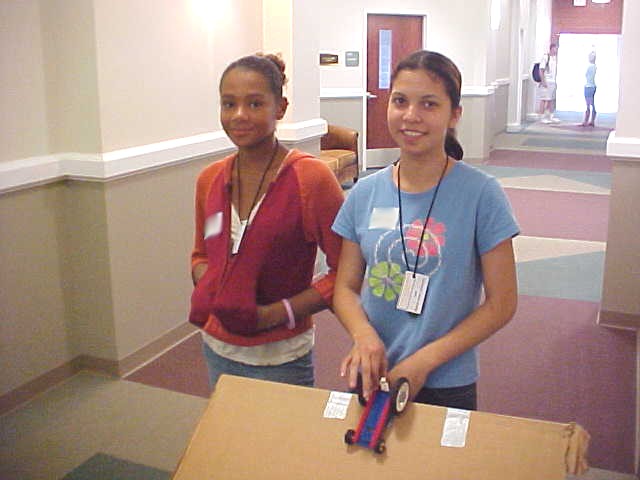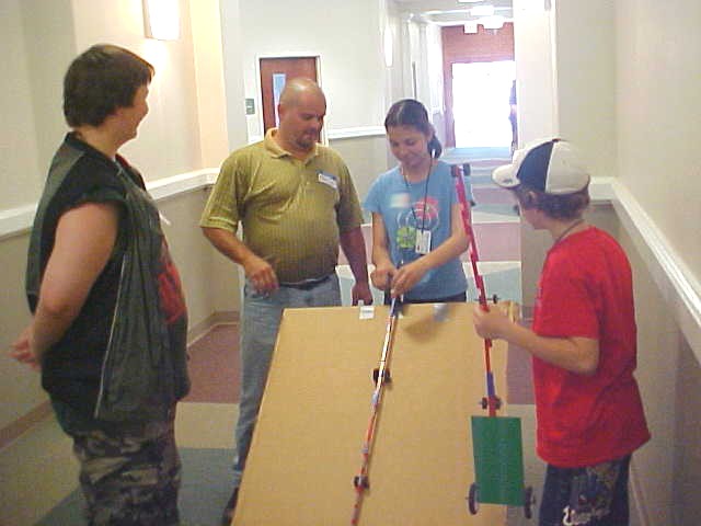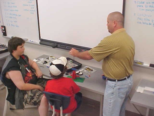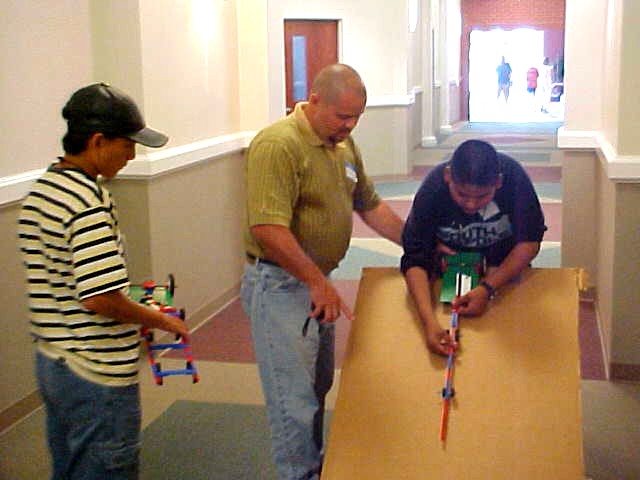 The first day of Robotics Camp 2005 in Murray, Kentucky, was a success. The campers began the day by gathering around the virtual campfire and discussing the plans for the day and for the week. The first activity was "," or "Costear para lo Máximo" which required camper teams to focus on using good building techniques to create vehicles that would coast as far as possible after going down a long ramp. They also worked on reducing friction as much as possible. This early construction activity will be helpful when we build our robotic vehicles later in the camp. A second challenge was introduced, "" or "Construya el Vehículo Más Largo." Campers were asked to design a vehicle that was as long as possible and that would still coast after going down the ramp. The record for the longest vehicle was 54 inches long. Finally, the campers were challenged by the activity, "" or "Una Torre." They had to build the tallest tower possible that would support a golf ball. The tallest one was 24 inches high! Both campers and staff are looking forward to tomorrow! We will be using gears, pulleys, and solar panels to create some very interesting vehicles!