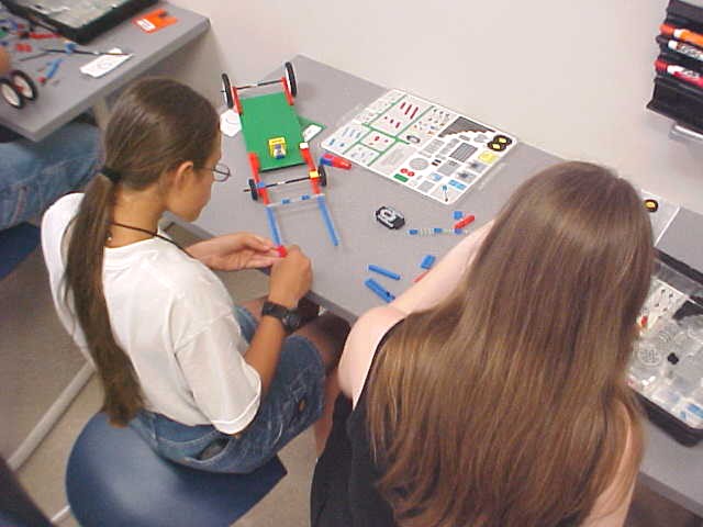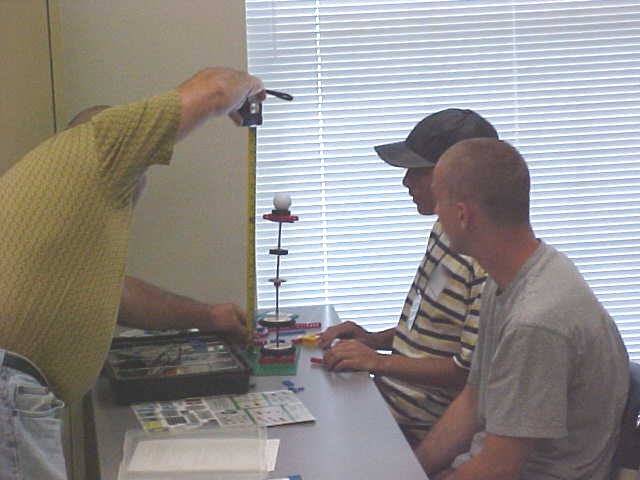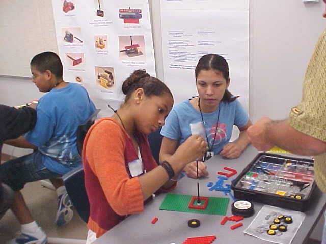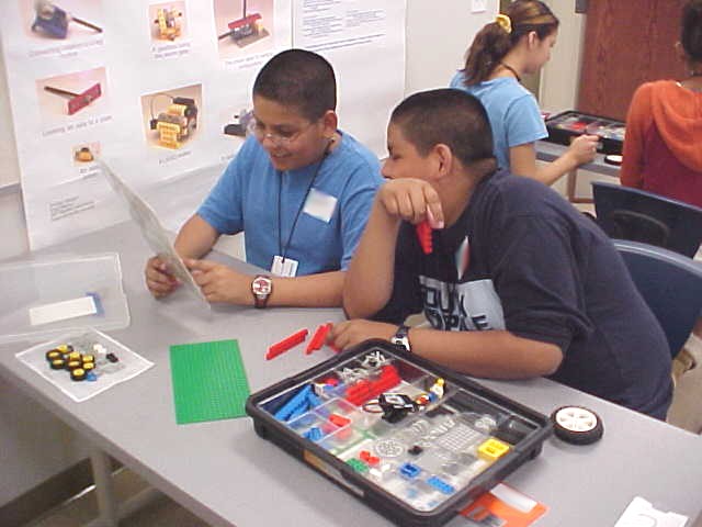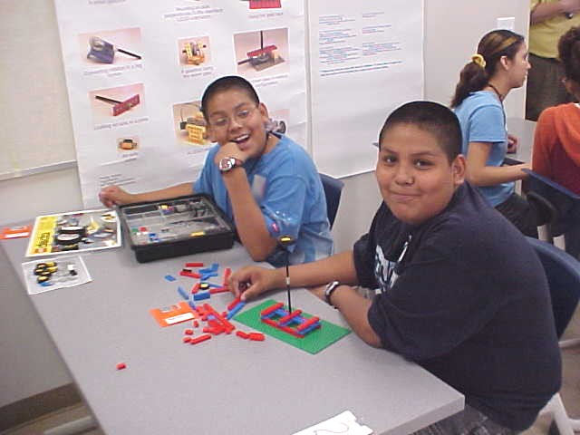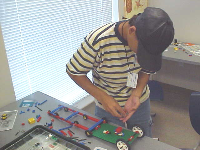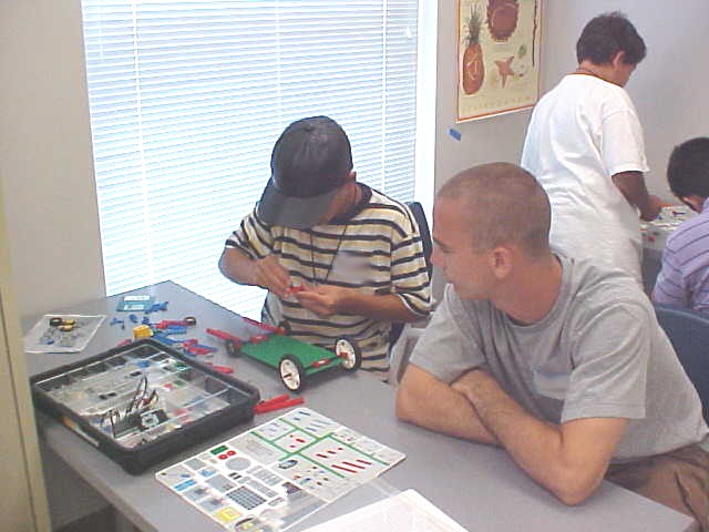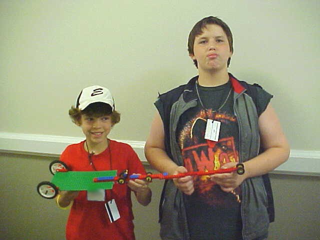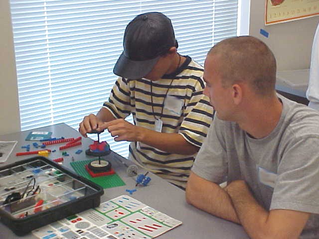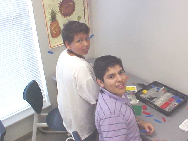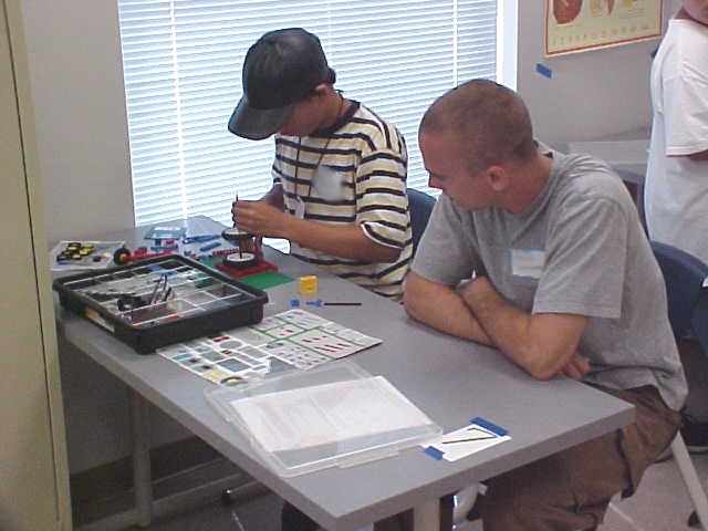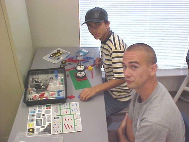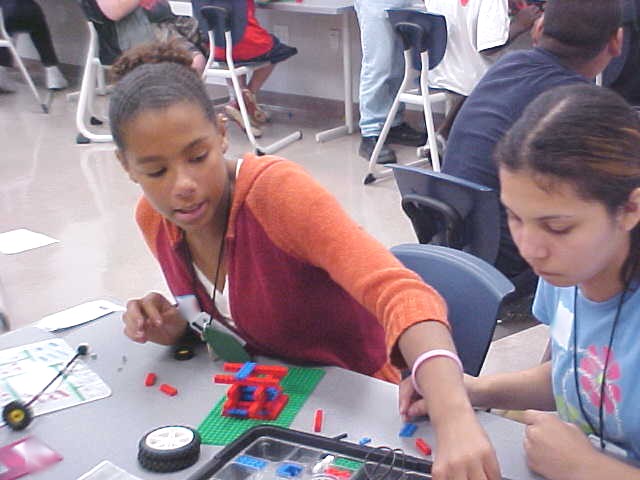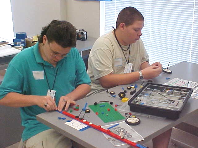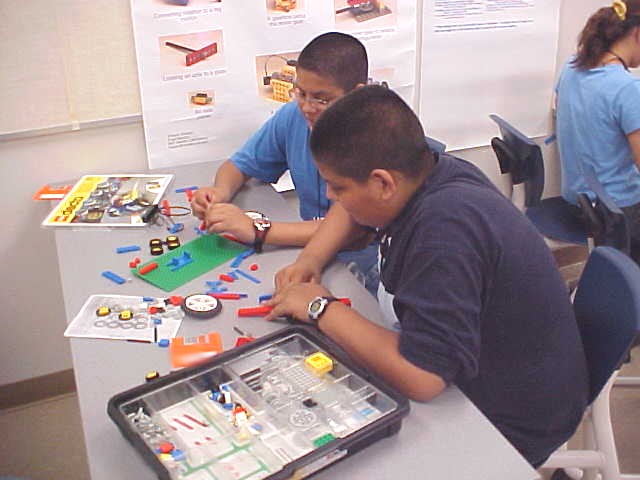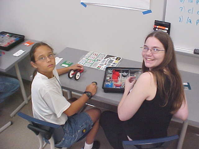 The first day of Robotics Camp 2005 in Murray, Kentucky, was a success. The campers began the day by gathering around the virtual campfire and discussing the plans for the day and for the week. The first activity was "," or "Costear para lo Máximo" which required camper teams to focus on using good building techniques to create vehicles that would coast as far as possible after going down a long ramp. They also worked on reducing friction as much as possible. This early construction activity will be helpful when we build our robotic vehicles later in the camp. A second challenge was introduced, "" or "Construya el Vehículo Más Largo." Campers were asked to design a vehicle that was as long as possible and that would still coast after going down the ramp. The record for the longest vehicle was 54 inches long. Finally, the campers were challenged by the activity, "" or "Una Torre." They had to build the tallest tower possible that would support a golf ball. The tallest one was 24 inches high! Both campers and staff are looking forward to tomorrow! We will be using gears, pulleys, and solar panels to create some very interesting vehicles!