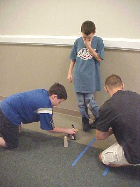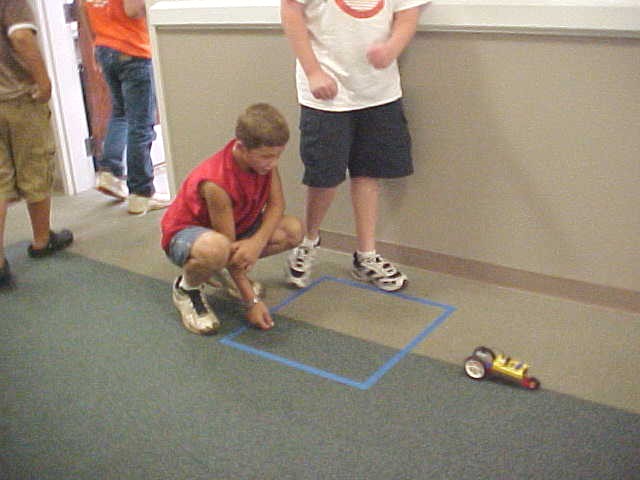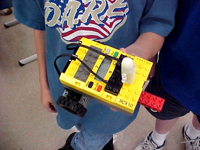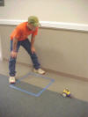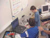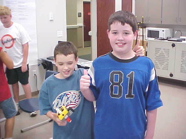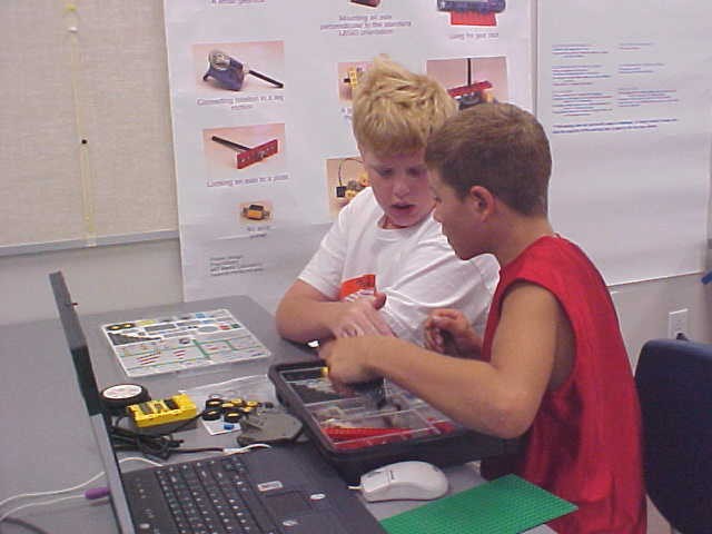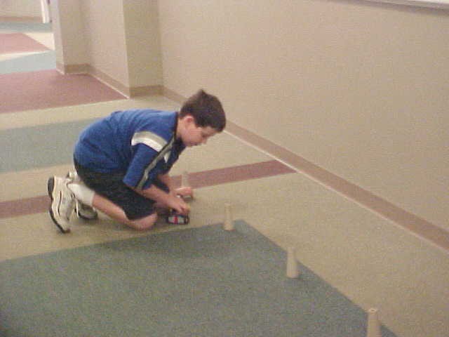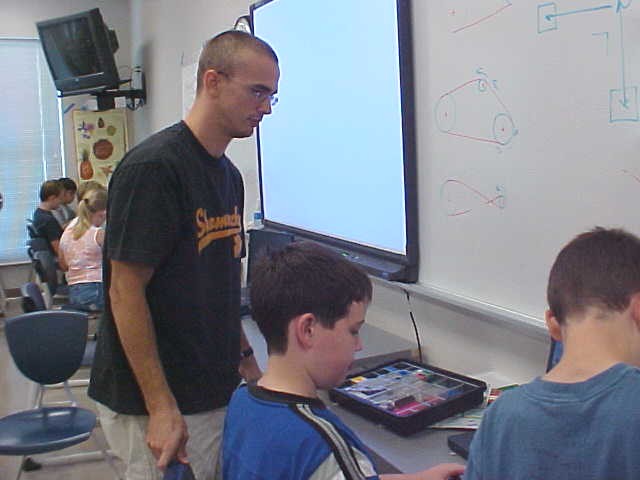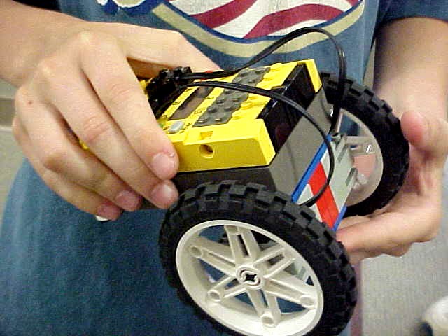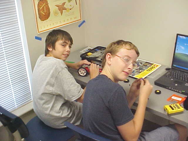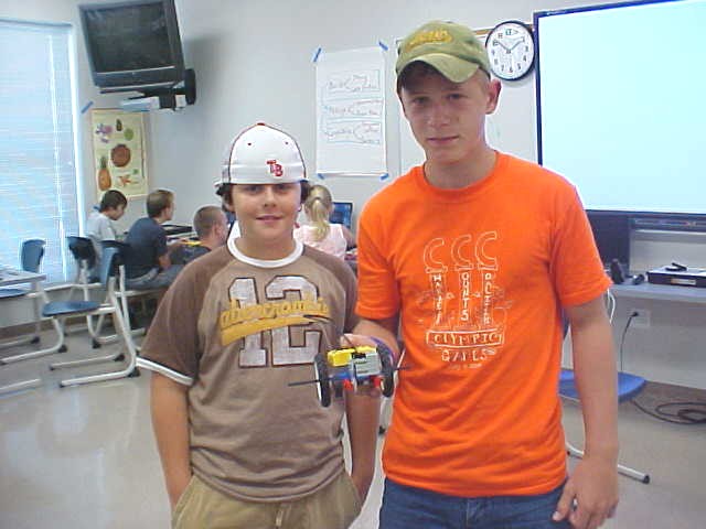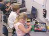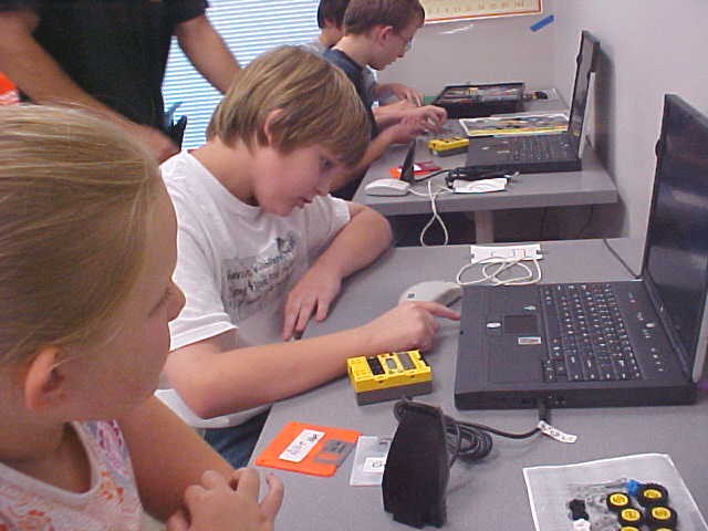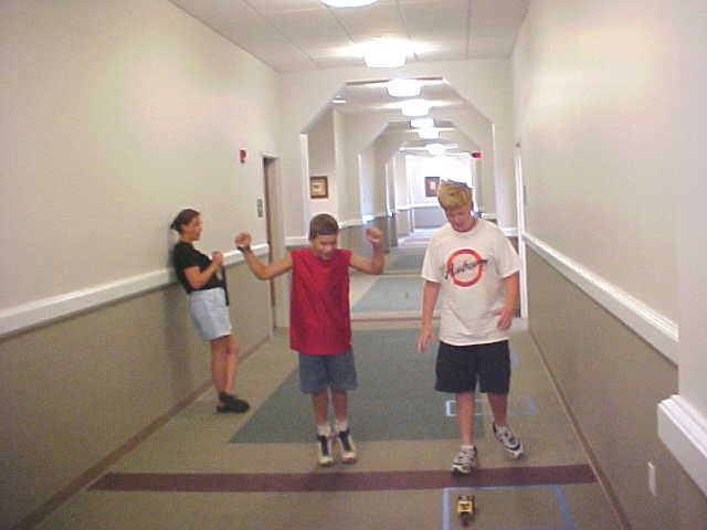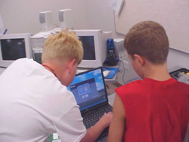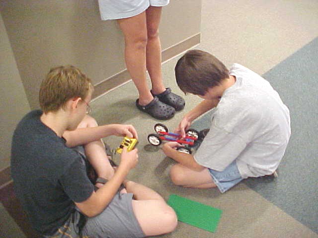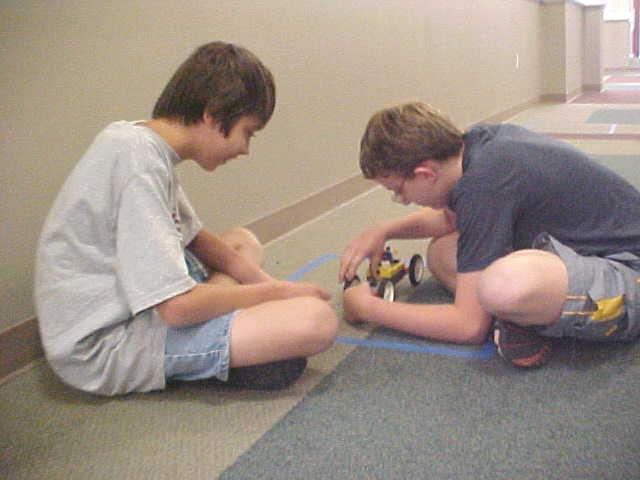 Day 3 was the turning point of Robotics Camp 2005 at Murray State. This was our first day of programming the RCX brick to complete challenging tasks using Pilot 1 of the RoboLab software. "Distance Doggy" was the name of the challenge that provided campers the chance to use the fundamentals of programming. Next, the campers were required to add a step to their program which allowed their vehicle to back from one box into another. Then came a multiple step program using Pilot 3 made use of changing the direction and the speed of the motors. The words "what" and "until" took on new meaning. "What" was the motor turning one direction or the other, and "until" was the length of time until the RCX told the "what" (the motor) to stop. Campers also began programming multi-step programs and designing their vehicles to make turns, the "Right Turn" challenge. Today's campers will never look at right turns the same ever again! Campers moved on to a more difficult challenge, "The Zig-Zag " where they had to program additional steps to go through an obstacle course. All campers were excited and are already planning for other challenging events for tomorrow, including the use of touch sensors and light sensors!