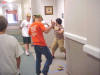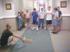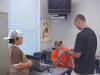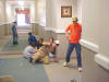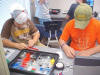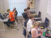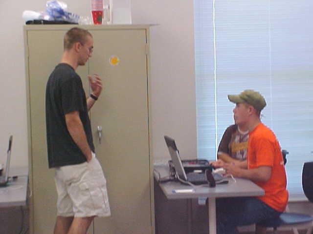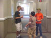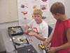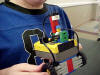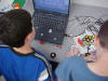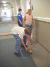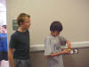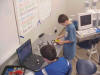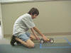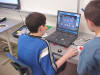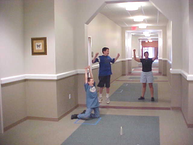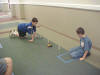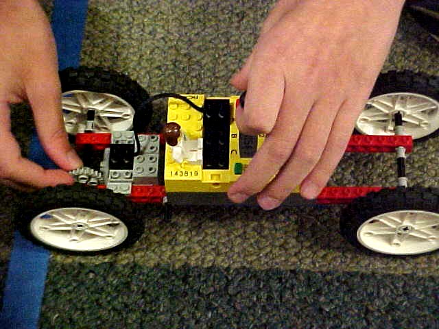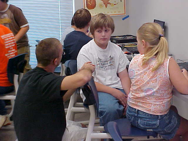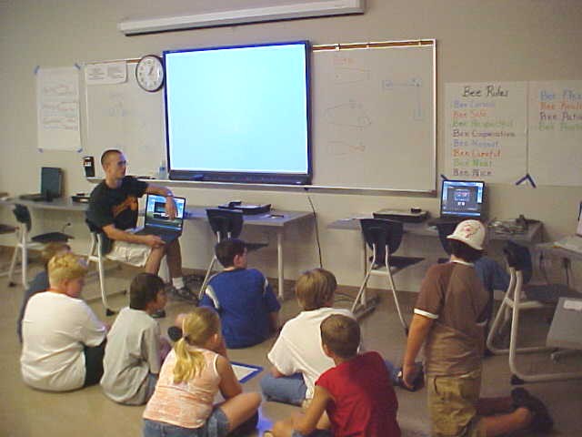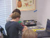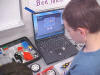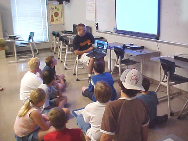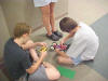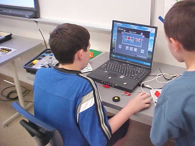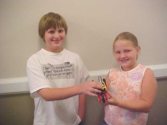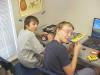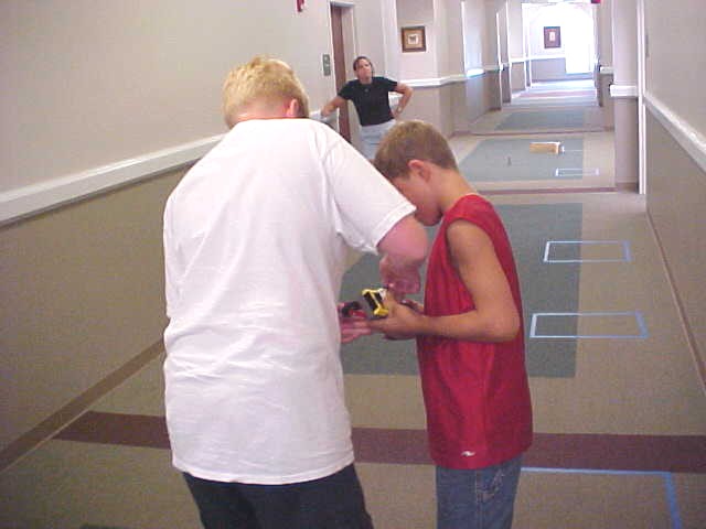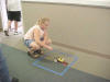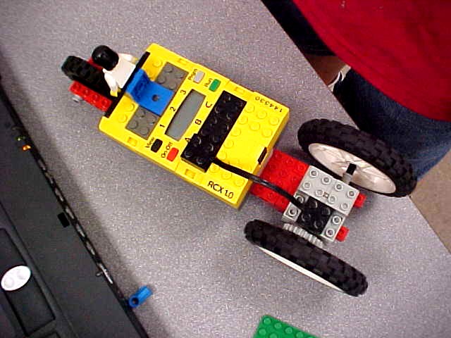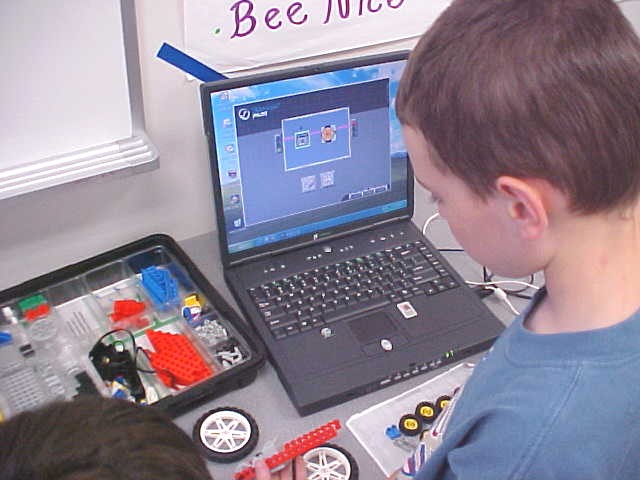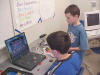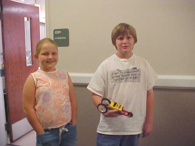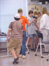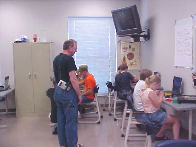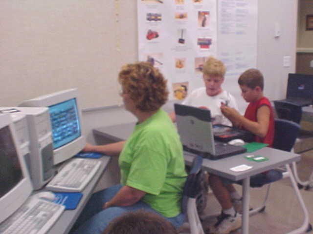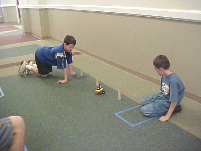 Day 3 was the turning point of Robotics Camp 2005 at Murray State. This was our first day of programming the RCX brick to complete challenging tasks using Pilot 1 of the RoboLab software. "Distance Doggy" was the name of the challenge that provided campers the chance to use the fundamentals of programming. Next, the campers were required to add a step to their program which allowed their vehicle to back from one box into another. Then came a multiple step program using Pilot 3 made use of changing the direction and the speed of the motors. The words "what" and "until" took on new meaning. "What" was the motor turning one direction or the other, and "until" was the length of time until the RCX told the "what" (the motor) to stop. Campers also began programming multi-step programs and designing their vehicles to make turns, the "Right Turn" challenge. Today's campers will never look at right turns the same ever again! Campers moved on to a more difficult challenge, "The Zig-Zag " where they had to program additional steps to go through an obstacle course. All campers were excited and are already planning for other challenging events for tomorrow, including the use of touch sensors and light sensors!